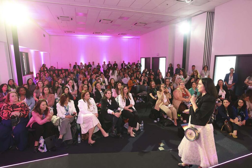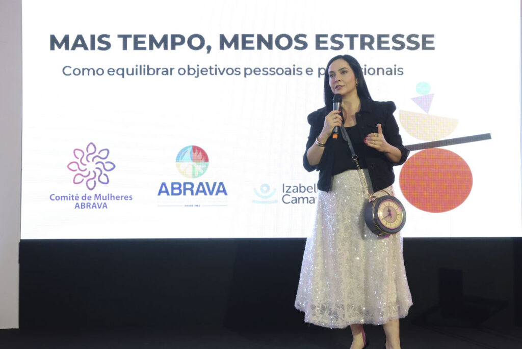 Após conhecer resultados inéditos da última pesquisa sobre o perfil feminino no setor, assim como as próximas metas do Comitê de Mulheres da ABRAVA, na voz de sua presidente Juliana Reinhardt, cerca de 200 pessoas ouviram Izabella Camargo falar sobre tempo e estresse no trabalho, durante Encontro pela primeira vez realizado em uma FEBRAVA.