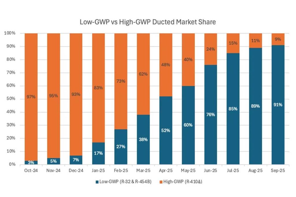 De acordo com o mais recente Relatório de Inteligência de Mercado Unitário da HARDI, associação de distribuidores de HVAC-R dos EUA, equipamentos com fluido refrigerante A2L, de baixo GWP e levemente inflamáveis, representaram 91% de suas vendas em setembro.